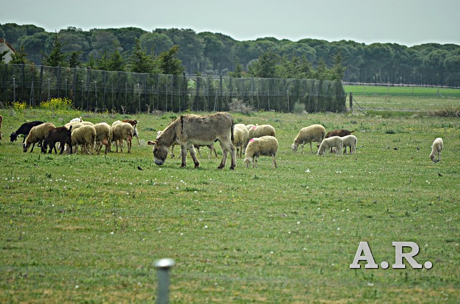 Curiosa imagen de un burro paciendo, casi parece cuidando, con una manada de ovejas.